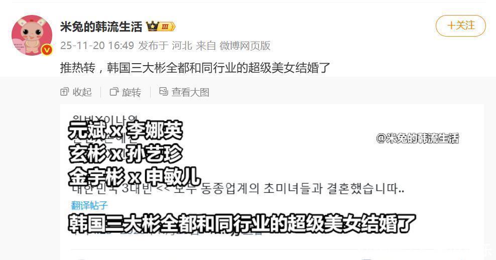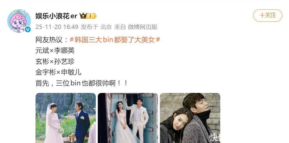 11月21日,“韩国三大Bin男神都娶了大美女”的话题突然刷屏网络,瞬间点燃了网友的八卦之魂。所谓“三大Bin”,指的是三位名字带“彬”(韩语发音为“bin”)的顶级男演员——元斌、玄彬、金宇彬。巧的是,这三位男神的配偶,清一色是韩国演艺圈公认的颜值与实力并存的女演员,堪称“顶配婚姻模板”。