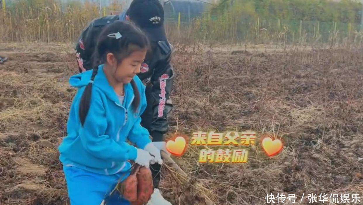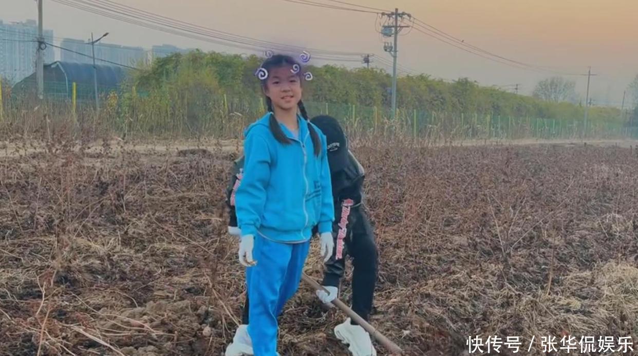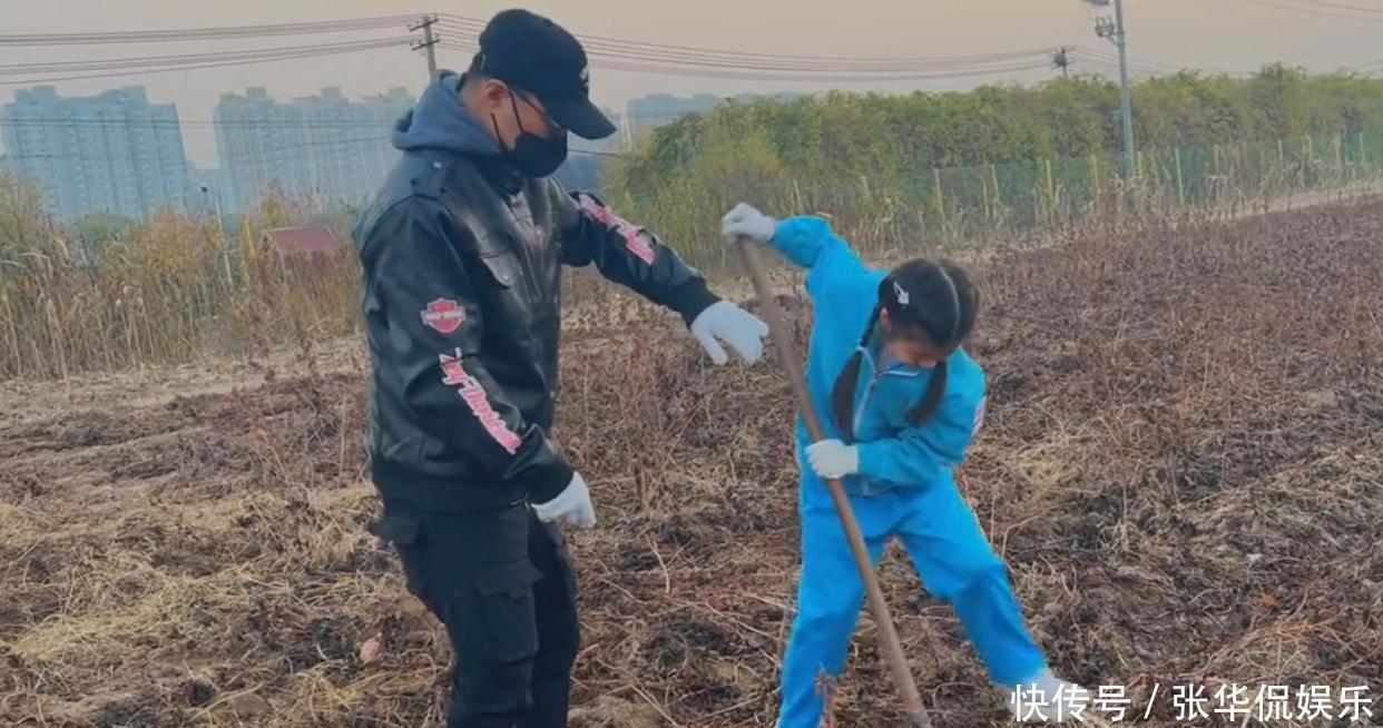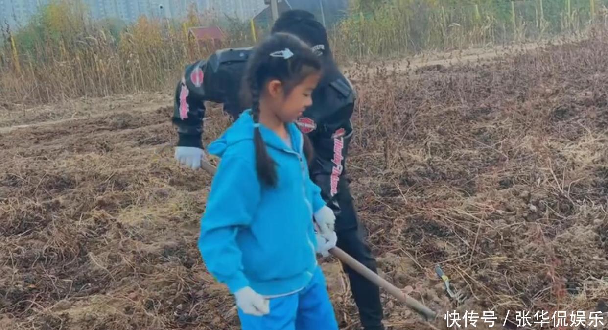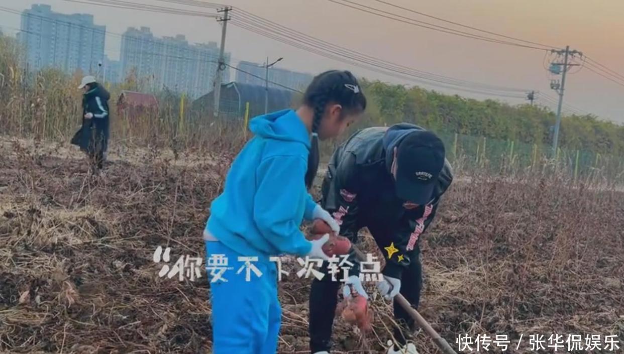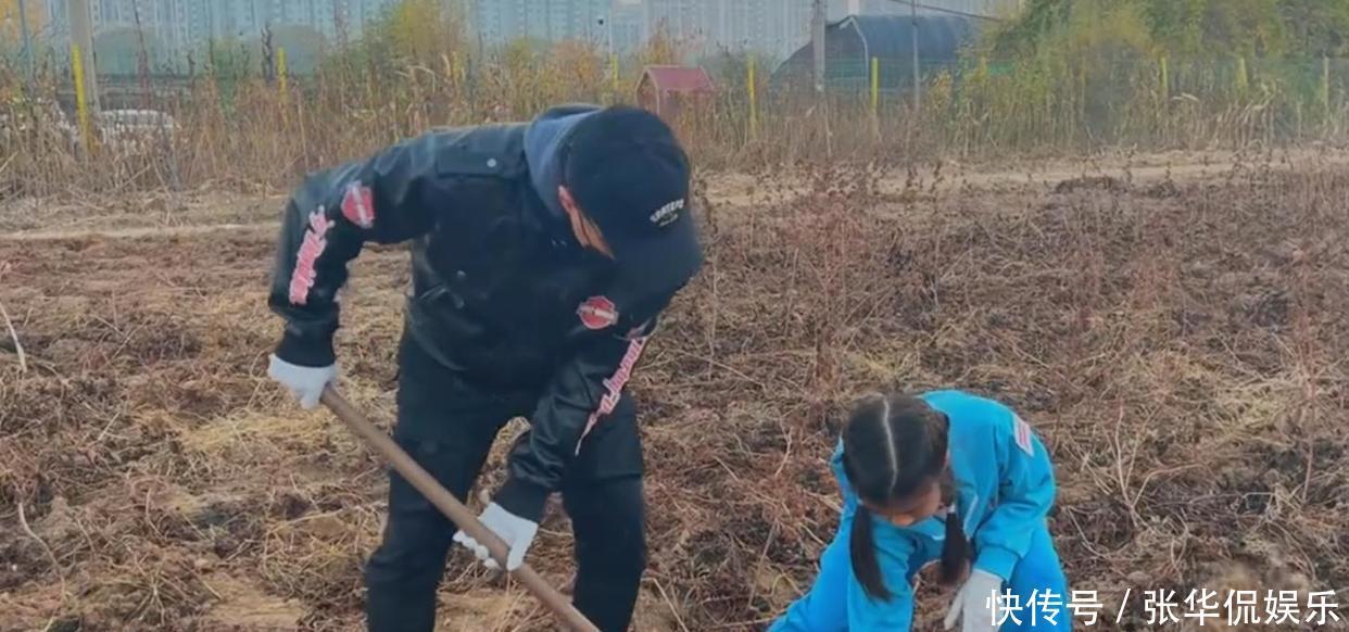 刚结束哈尔滨演唱会的汪峰,身穿黑色衣服手握铁锹,带着扎双麻花辫、穿蓝色休闲装的醒醒在红薯地里忙碌。醒醒看起来又高又瘦,特别亮眼。